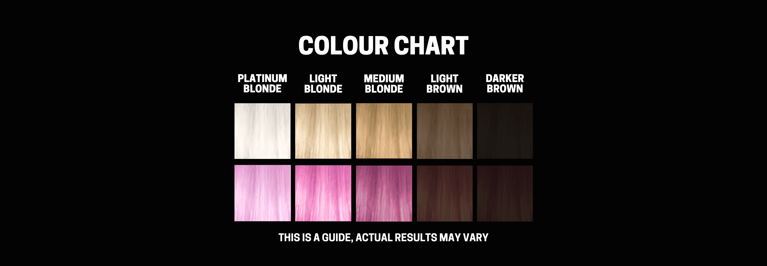 SEMI PERMANENT COLOUR WORKS BEST ON HAIR BLEACHED TO HIGHER LEVEL BLONDE. IF YOUR HAIR IS NOT BLEACHED TO A HIGH BLONDE, YOU WILL NOT ACHIEVE A PINK SHADE. WE RECOMMEND USING COLOURS WITH HIGH PIGMENTS SUCH AS BLUES & REDS. COLOUR RESULT CAN DEPEND ON MULTIPLE FACTORS MAINLY THE BASE COLOUR OF YOUR HAIR.